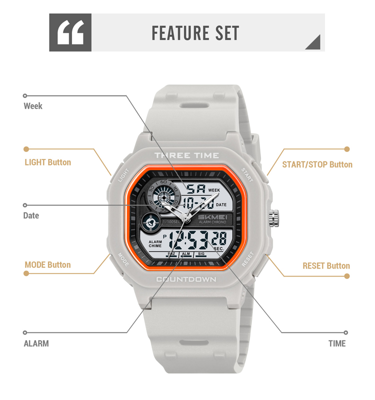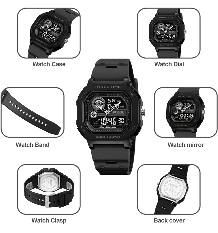 Function:3Time,Chrono,Alarm,Date ,Week,12/24 Hour clock, Count down timer